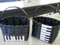 今回はクラフトバンドでカゴを編み、最後に鍵盤部分を貼り付けて、ピアノのかごバッグを作りました。
