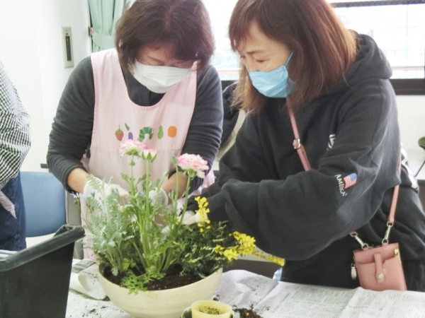 花の専門家である講師からポイントやコツを教わりながら、お好みのレイアウトで春らしい明るい寄せ植えを作りました。